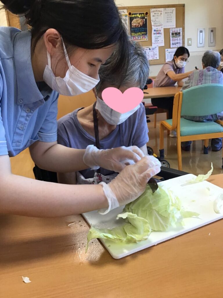 ご入居者様の中には片麻痺の方もいらっしゃいますが、職員さんのサポートで、一緒に調理作業をしたり