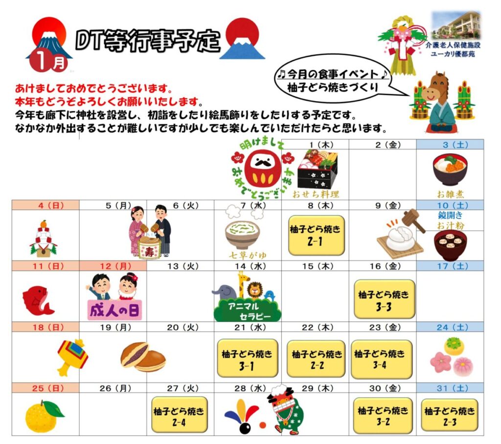 1月は、おせち料理から始まり、イベントは「ゆずどらやき作り」となっております。